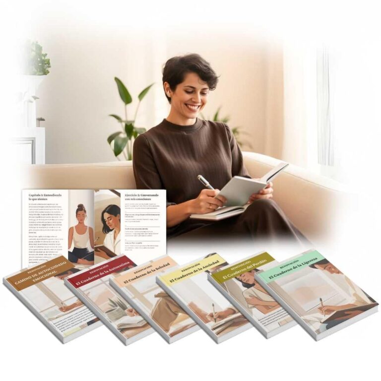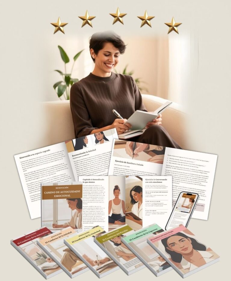 Además del cuaderno principal RENOVACIÓN, recibirás 6 cuadernos complementarios , diseñados para profundizar en tu proceso de autocuidado y acompañarte en cada etapa de tu crecimiento emocional.