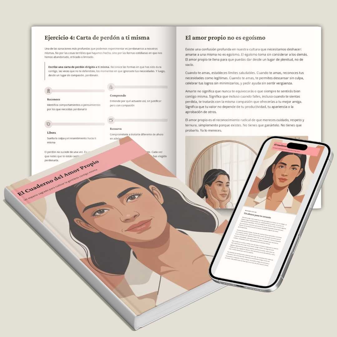 Amarte no es egoísmo, es regresar a casa. Este cuaderno te enseña a tratarte con la misma ternura que ofreces a los demás. Aprenderás a poner límites saludables, a validar tus emociones y a construir una relación amorosa contigo misma.